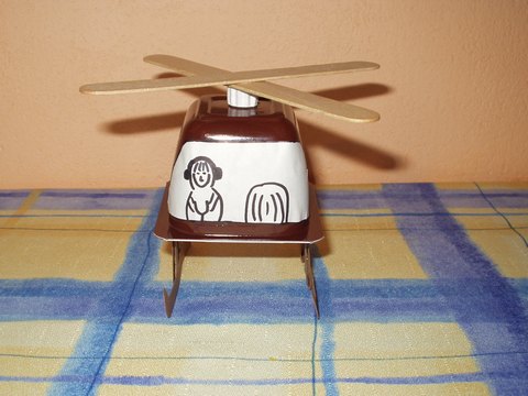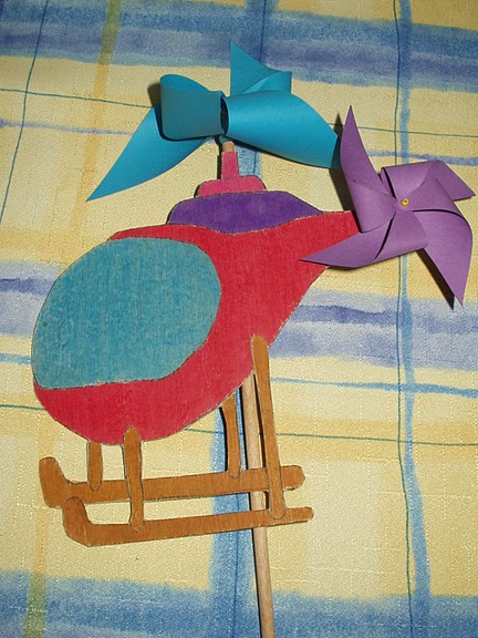 Pro svého syna, když byl ještě malý, jsem vyrobila tyto dva vrtulníky. Jeden byl jako větrník (z tvrdého papíru) a druhý jako hračka (kelímek od pudinku, doktorské špachtle, samolepky, papír). (Alena M.) http://picasaweb.google.cz/alcinykoralky