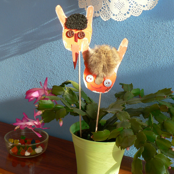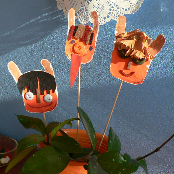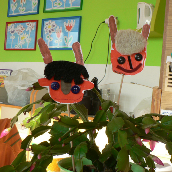 Dítěti natřeme oranžovou temperou dlaň-čertí pusinka, hnědou temperou malíček a ukazováček-rohy, otiskneme natřenou ručku na výkres, tím máme základ na čertí zapichovátko, pak už jen dolepíme nebo dokreslíme oči, nos, pusu, vlasy, jazyk. Vystřihneme, ze zadu nalepíme špejli a zápich je hotový.
