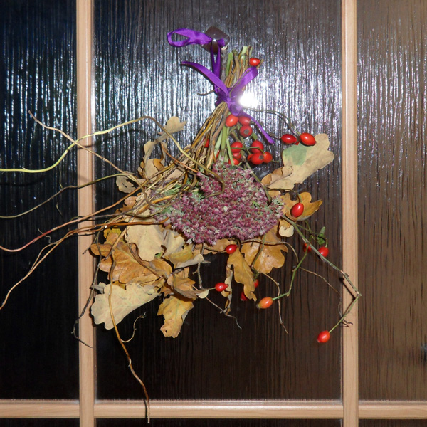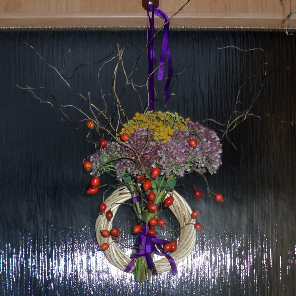 Suroviny: větvičky šípků zbavené trnů, vrbové větvičky zbavené listů, nasušené květy žlutého hřebíčku, dubová větvička s listy, jakékoliv nasušené kvítí ze zahrádky, stužka, proutěný věneček
