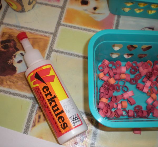 Pomůcky: barevný papír (červený), barevný sisal, lepidlo, kolíček na prádlo, tavná pistole.
